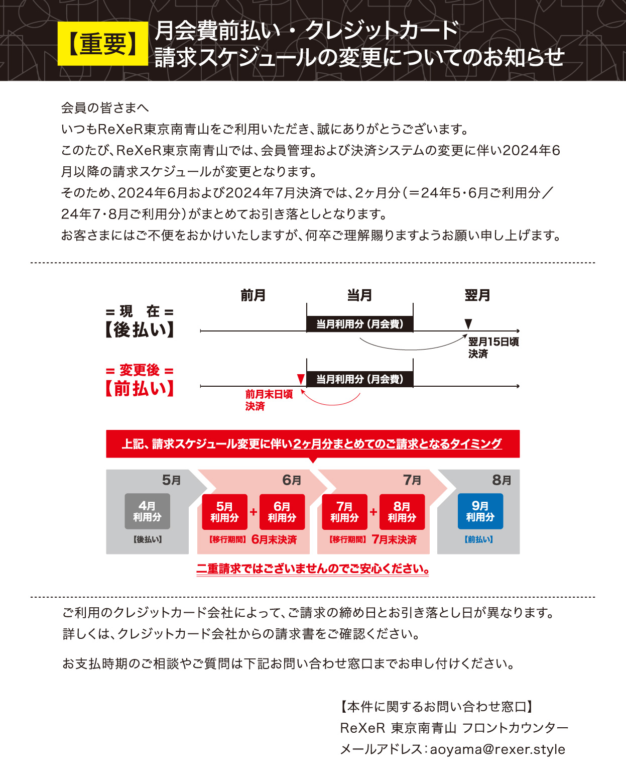 ReXeR南青山では、会員管理および決済システムの変更に伴い、2024年6月以降の請求スケジュールが変更となります。